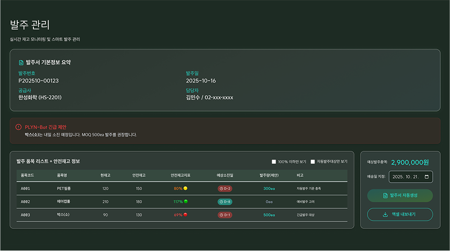 • AI calculates optimal order timing and quantities based on lead time and MOQ